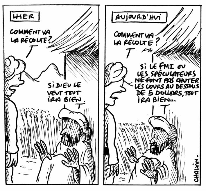 Entre 1960 et 1990, le cours des matières 1° agricoles et minières a baissé de 25 % et les prix des biens manufacturés ont continué à croître. Pour échapper à cette baisse des ressources, les pays africains ont produit plus, en resserrant le noeud coulant de la dépendance à l’égard du marché international, les grosses sociétés commerciales, conservant le transport et la commercialisation des produits.
