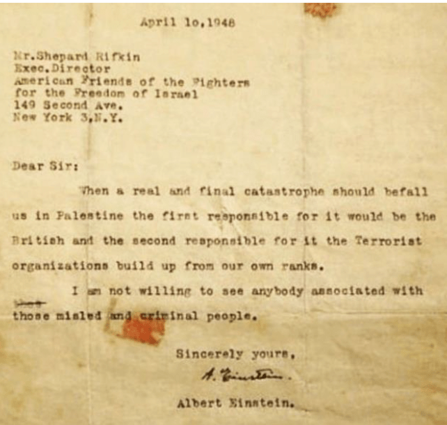 Lorsqu’ une catastrophe réelle et finale nous surprendra en Palestine, les premiers responsables seront les Britanniques et les seconds seront les organisations terroristes nées de nos rangs. Je ne veux voir personne qui soit associé à ces gens qui font fausse route et sont des criminels ». Cordialement – Albert Einstein