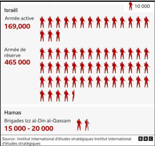 Les USA sont le principal fournisseur en armements et parrain de l’entité sioniste. Porte-avions et autres navires de guerre sont sur place. Il n’est nullement question d’un conflit asymétrique, mais d’un conflit entre deux États, Israël, État juif et démocratique (notons l’oxymore!) et l’autre fanatique-religieux (le Hamas), deux États qui «s’équivalent » militairement en raison de l’appui supposé ou réel du second par les « forces du mal » (Iran, Hezbollah…). Le rapport de force nous est illustré dans le tableau ci-dessous.