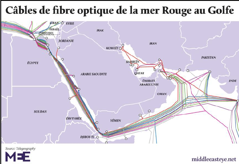 L’existence d’un réseau de câbles de fibres optiques sous-marins (Internet, espionnage…) reliant les pays asiatiques, africains et européens et passant justement par Bab Al Mandab (en Mer rouge où la profondeur des eaux ne dépasse pas les 200 mètres), amplifie la complexité de la situation et les risques de dérapages voire de déstabilisation de toute la région si le génocide des Palestiniens continue. Ce qui porterait un coup sérieux aux BRICS, un objectif convoité et à atteindre pour les États-Unis.