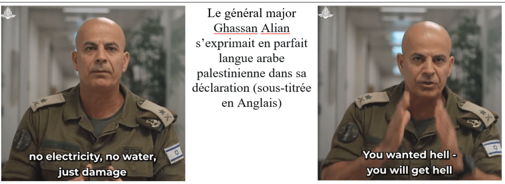 Que diraient-ils sur les propos tenus par le général sioniste Ghassan Alian[12] (voir captures d’écran tableau ci-dessous) sur les Palestiniens : « pas d’électricité, pas d’eau, que des dégâts… vous vouliez l’enfer, vous aurez l’enfer» pendant que Yoav Gallant les traitait d’animaux humains en plus d’être des terroristes.