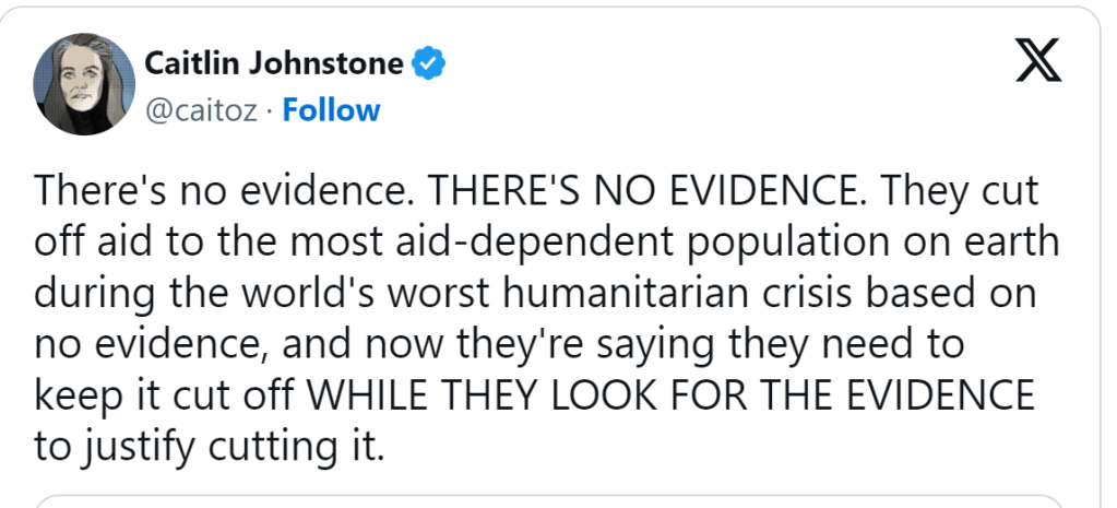 Il n’y a pas de preuves. IL N’Y A AUCUNE PREUVE. Ils ont coupé l’aide à la population la plus dépendante de la planète pendant la pire crise humanitaire du monde, sans aucune preuve, et maintenant ils disent qu’ils doivent continuer à la couper pendant qu’ils cherchent les preuves pour la justifier.