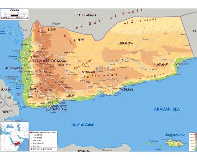 La république du Yémen est un pays du Moyen-Orient situé à la pointe sud-ouest de la péninsule d’Arabie. Elle possède une frontière terrestre avec l’Arabie saoudite au Nord et avec Oman à l’Est, et une frontière maritime avec Djibouti et l’Érythrée à l’Ouest et la Somalie au Sud. Elle présente une importante façade maritime sur le golfe d’Aden, une autre sur la mer Rouge, et contrôle, avec Djibouti, le détroit de Bab-el-Mandeb qui mène vers le canal de Suez. Sa capitale, Sanaa, se situe dans l’ouest du pays, et son principal port est Aden.