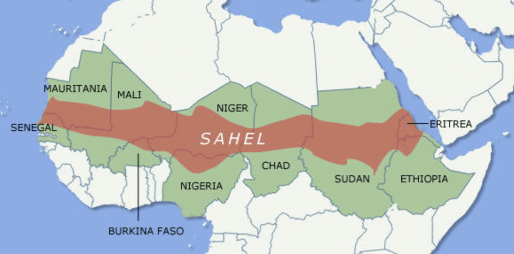 Le Sahel est le territoire de l’Afrique, où la partie nord désertique (principalement le Sahara) se transforme progressivement en jungle équatoriale, formant une large bande de savanes. Le Sahel comprend sept pays principaux (d’ouest en est) : le Sénégal, le Mali, le Burkina Faso, le Niger, le Tchad, le Soudan et l’Érythrée. Seulement environ 6 000 kilomètres (c’est la distance de Saint-Pétersbourg à Khabarovsk).