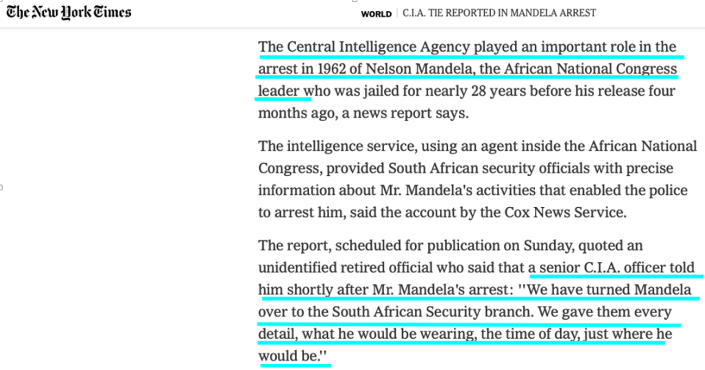 « Par l’intermédiaire d’un agent au sein du Congrès national africain, le service de renseignement (la CIA) a fourni aux autorités de sécurité sud-africaines des informations précises sur les activités de M. Mandela, ce qui a permis à la police de l’arrêter (…). »