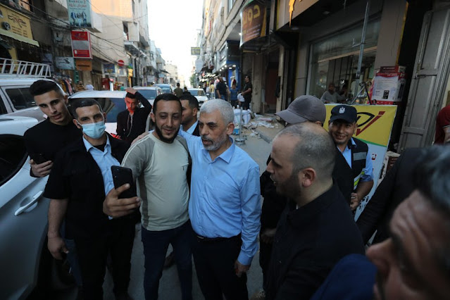 Yahya Sinwar avec des partisans alors qu’il visite le quartier d’Al Rimal dans la ville de Gaza, le 26 mai 2021. Photo : Ashraf Amra/APA Images