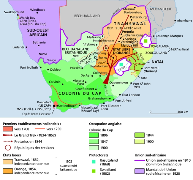 La faillite de la VOC en 1798, et l’organisation des Patriotes du Cap, (aidée par les Français), permettent la conquête par le Royaume-Uni du cap de Bonne-Espérance, officiellement annexée en 1814 après le traité de Paris. La colonie britannique est établie avec 25 000 esclaves, 20 000 colons blancs, 15 000 Khoï et San et 1 000 esclaves noirs libérés. Les sociétés missionnaires anglicanes s’y installent pour convertir les tribus hottentotes. Londres fait interdire le commerce des esclaves. Des missions évangélistes s’installent en pays xhosas pour former une élite noire. Au Cap, des mesures sont prises en faveur des KhoïKhoï et des esclaves mais des familles boers perçoivent ces avancées comme une atteinte à leurs libertés. Le fossé s’élargit:, Ils dominent la politique, la culture et l’économie et les Boers sont dans les fermes. En 1820, près de 5 000 colons britanniques débarquent au Sud-Est du Cap et fondent la ville de Port Elizabeth, à la frontière des territoires xhosas. L’idée est de créer une zone tampon mais les colons préfèrent se retirer dans la ville. L’afrikaans, est dénigré et en 1828, l’Anglais devient la seule langue officielle pour les affaires administratives et religieuses. L’égalité des droits est proclamée dans la colonie du Cap entre KhoïKhoï et Blancs avec le droit à la propriété pour les Noirs. En 1833, l’esclavage est aboli et les propriétaires des 40 000 esclaves de la colonie sont indemnisés.
