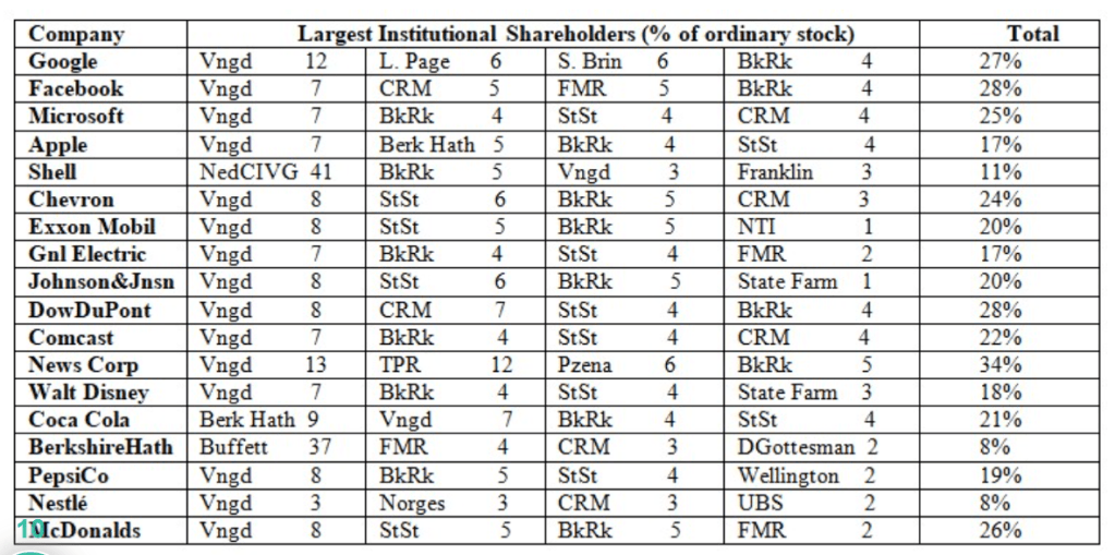 « (Les avoirs combinés des trois grands suggèrent qu’ensemble) ils occupent une position de pouvoir potentiel inégalé sur les entreprises américaines… (Nous assistons à) une concentration de la propriété des entreprises, jamais vue depuis l’époque de JP Morgan et JD Rockefeller. Cependant, ces capitalistes financiers de l’âge d’or ont exercé leur pouvoir sur les entreprises directement et ouvertement, par le biais de leur participation au conseil d’administration et de leurs directions imbriquées. Ce n’est pas le cas des trois grands, (qui s’appuient généralement sur) des formes plus cachées de gouvernance d’entreprise. » (Fichtner et al., 2017, pp.2-17)
