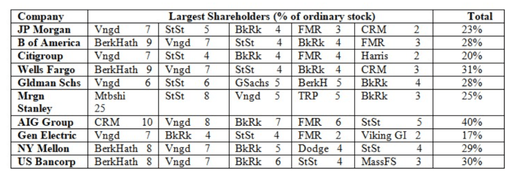 Après une enquête plus approfondie, il s’avère que ces mêmes entités financières qui détiennent des participations substantielles dans JP Morgan, HSBC et Citigroup (et à travers elles une grande partie des principaux secteurs économiques australiens) dominent également la propriété de la plupart des autres grandes sociétés cotées en bourse du secteur financier aux États-Unis (y compris de nombreuses sociétés qui sont communément considérées comme des puissances financières et économiques à part entière, telles que Bank of America, Wells Fargo, Goldman Sachs et Morgan Stanley). En effet, en suivant les lignes de propriété des principales sociétés de la plupart des principaux secteurs économiques cotés en bourse aux États-Unis ou en Australie, on aboutit presque toujours à ce que les mêmes cinq ou six institutions financières (Vanguard, BlackRock, State Street Corporation, Fidelity MR, Capital RM et T. Rowe Price Associates) figurent parmi les dix plus gros actionnaires.