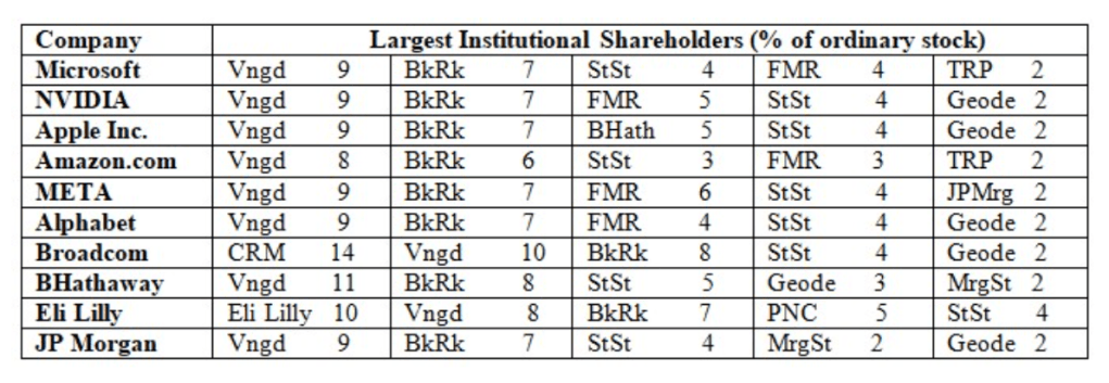 Un autre échantillon illustratif de la propriété des entreprises aux plus hauts sommets de l’économie américaine sera inclus ici afin de fournir un dernier aperçu exploratoire du pouvoir financier et de la propriété et du contrôle des entreprises (voir tableau 5) : une enquête auprès des principaux actionnaires institutionnels des dix plus grandes entreprises (par capitalisation boursière) cotées à l’indice Standard & Poor’s 500 (mesurée en pourcentage du total des actions ordinaires détenues par chaque entreprise à partir de données compilées en juin 2024).