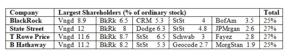Bien que les chiffres cités ci-dessus ne soient qu’une estimation de base, dans la plupart des cas, la participation totale des quatre principaux investisseurs institutionnels est probablement un peu plus élevée que les pourcentages cités ci-dessus, dispersée à travers des participations plus petites d’autres entités contrôlées – les chiffres ont été compilés à partir d’une liste des vingt plus gros actionnaires de chaque société (les participations plus petites ne sont donc pas incluses), et les estimations ne prennent pas non plus en compte les participations d’autres entités corporatives partiellement contrôlées.