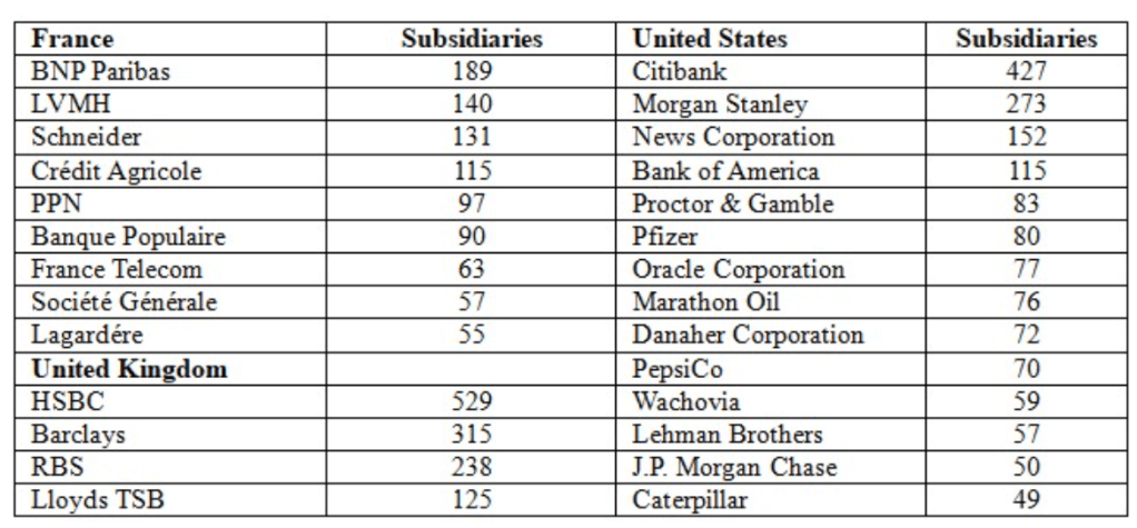 Une autre étude commandée par le Congrès des syndicats britanniques en 2009 a révélé que les cinq plus grandes banques britanniques (Lloyds, TSB, RBS, HSBC et Barclays) avaient plus de 1 200 filiales dans des paradis fiscaux, soulignant que : « Comme dans les études américaines et britanniques : si de nombreuses entreprises possèdent de nombreuses filiales dans des paradis fiscaux, ce sont les banques et les sociétés financières qui ont tendance à se démarquer… Il s’avère que toutes (les cinq plus grandes banques) ont une présence substantielle dans les paradis fiscaux. » (TJN, 2009a) Le tableau suivant répertorie le nombre de filiales détenues par de grandes entreprises basées aux États-Unis, au Royaume-Uni et en France qui sont enregistrées dans des juridictions classées comme paradis fiscaux. Les données ont été compilées à partir de rapports établis par le Tax Justice Network et le Government Accountability Office (TJN, 2009a ; TJN, 2009b ; GAO, 2008).