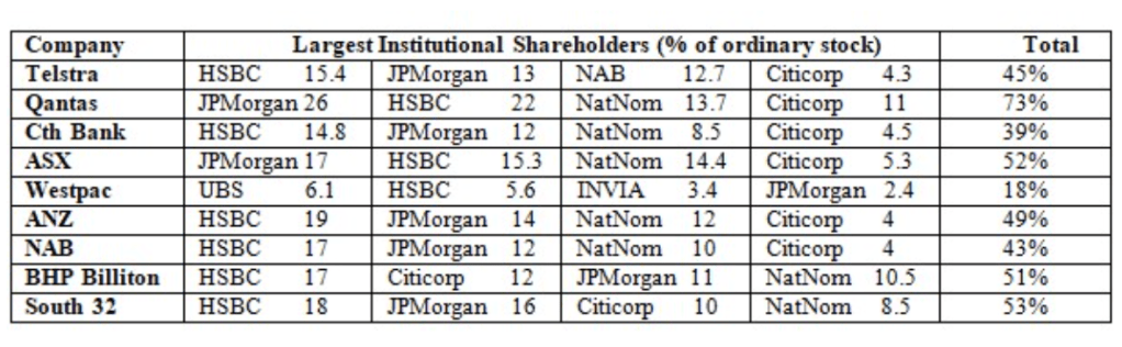 En dressant il y a quelques années une liste des actionnaires des principales entreprises de certains des secteurs les plus stratégiques et les plus rentables de l’économie australienne, il est rapidement apparu que la quasi-totalité d’entre elles sont détenues en grande partie ou majoritairement et potentiellement contrôlées par quatre entités financières seulement : JP Morgan, Citibank, HSBC et National Nominees. Ces quatre sociétés détiennent également la majorité des actions de la Bourse elle-même (Australian Stock Exchange – ASX) et jouent donc un rôle privilégié dans la gestion, la supervision et la réglementation quotidiennes de leur activité. Les chiffres précis pour les entreprises interrogées sont les suivants.