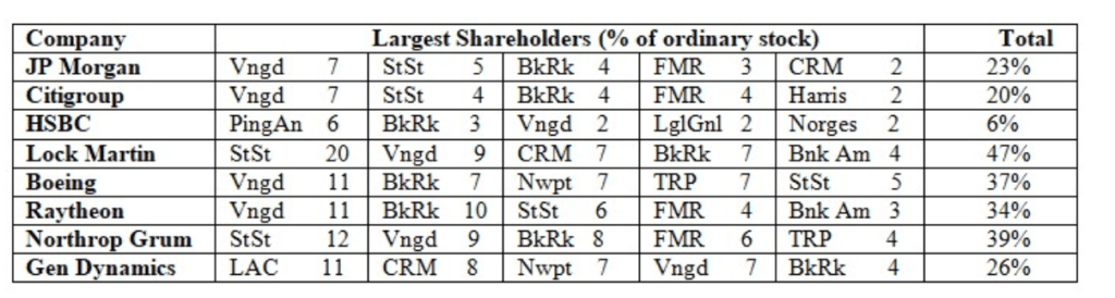 L’étude oublie toutefois un détail essentiel : les six mêmes entités financières citées ci-dessus figurent également en bonne place parmi les plus gros actionnaires institutionnels de toutes les sociétés d’armement examinées (voir le tableau 2, qui comprend également un résumé des plus gros actionnaires de JP Morgan, Citibank et HSBC – cette dernière domiciliée au Royaume-Uni). En effet, Vanguard (Vngd) et BlackRock (BkRk) sont en tête de liste des plus gros actionnaires des cinq piliers du complexe de guerre permanent, suivis de State Street Corporation (StSt), qui figure parmi les cinq plus gros actionnaires de quatre des sociétés. Parallèlement, Capital RM (CRM), Newport Trust (Nwpt), Fidelity MR (FMR), Bank of America (BofAm) et T Rowe Price (TRP) figurent parmi les cinq plus gros actionnaires de deux des sociétés d’armement.