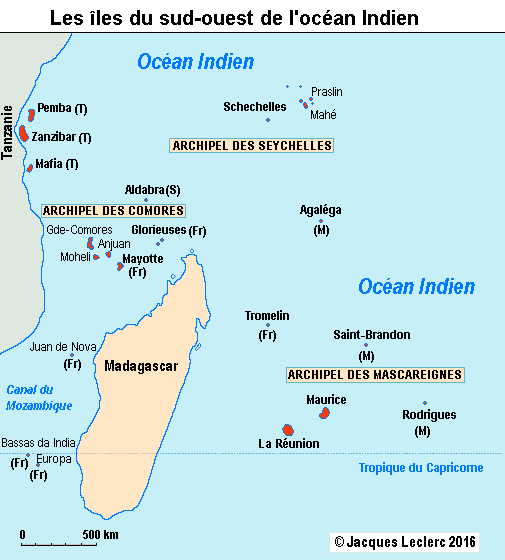 Les 3 premières forment l’union des Comores, pays indépendant, tandis que l’île de Mayotte (composé des îles Grande-Terre et Petite-Terre), île la plus au sud-est et les îles environnantes sont un département français.