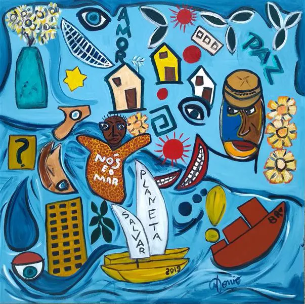 Antonio Souza, Brésil, Cadê minha praia ? O mar levou ou Où est ma plage ? La mer l’a emportée, 2019. Le texte dans le tableau se lit, de haut en bas et de gauche à droite, «amour», «paix», «nous» et «la mer», «sauver» et «planète».