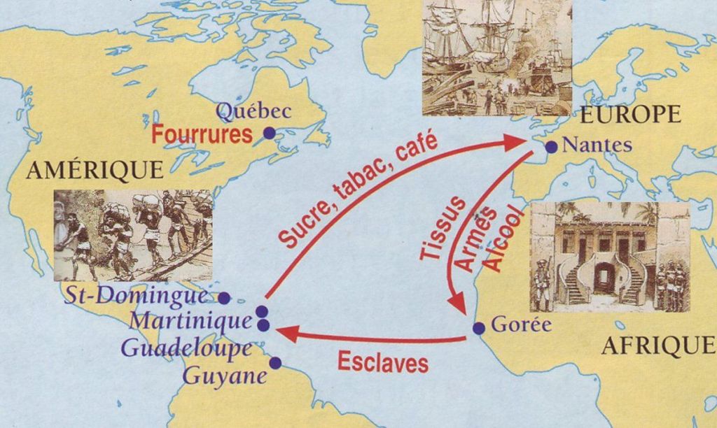 Il s’agit de l’achat par des négociants français, à des colons-trafiquants européens en Afrique (et à leurs collaborateurs africains, avec contre-partie souvent en armes) de prisonniers de guerres dans le but de les réduire en esclavage. Ces commerçants se déplacent sur les navires des armuriers des ports français de l’Atlantique, qui vont charger les esclaves et les transporter aux Antilles pour qu’ils les vendent aux planteurs de cannes à sucre. Puis ils rapportent la production en France. Négociants, propriétaires de navires et colons propriétaires de plantations font d’énormes profits. Pour la France, ce trafic commence véritablement en 1674