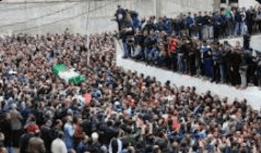 Un cortège de plus d’une lieue passait par Bab J’did en ce jour du 1er décembre 2016. Des milliers de personnes suivaient, le pas lent, le cercueil recouvert du drapeau national. Des you-you stridents se faisaient entendre des balcons. Au fur et à mesure que le cortège remontait l’avenue, la foule devenait plus compacte et les trottoirs noirs de monde. Une vue aérienne d’Alger – si elle avait été prise cet après-midi là – aurait montré une immense tache noire du côté nord de la ville. La rampe Louni Arezki était submergée de monde. Au grand tournant du C.E.M1 Tidjani, deux vieux personnages, assis, tenant une canne à la main, regardaient, étonnés, ce flot humain remonter la grande artère.