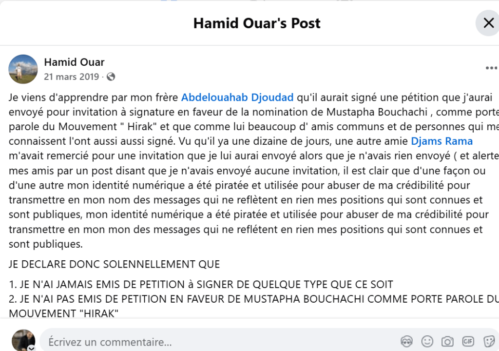 La manœuvre autour de Mustapha Bouchachi échoua. Une lettre de Ali Yahia Abdenour sur les rapports troubles de la LADD et de son président avec l’argent y contribuera également. (Et également publié sur mon blog personnel) une semaine après ces extraits. Vous trouverez dans cette publication un reflet de ces luttes intenses engagées autour de la désignation d’un « chef » du « Hirak » mais en réalité pour imposer un Conseil de Transition opposé à celui que préparaient certains cercles du pouvoir en alliance avec certains partis.