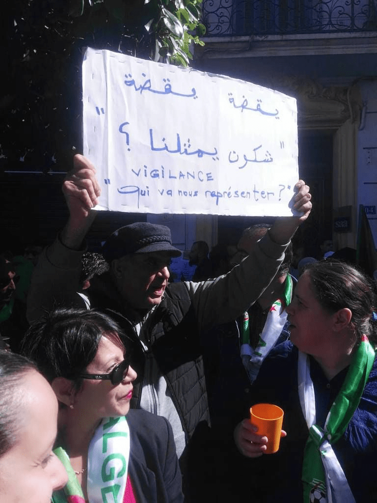 Un contenu contre le néocolonialisme : « Makach al kahmaça yaouled frança » (Pas de cinquième mandat, progéniture de la France) a été aussi un moment significatif de l’évolution très rapide des slogans. Cette pancarte le dit mieux que mille prises de parole.