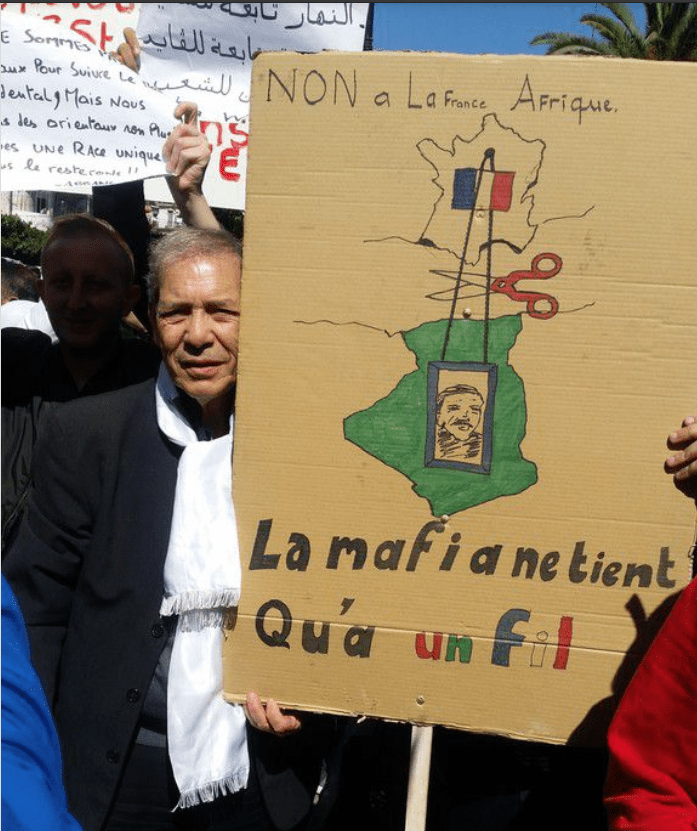 j’ai tenu à me photographier avec cette pancarte visualise quelle alliance secrète relie certains cercles du l’Etat algérien avec Paris.