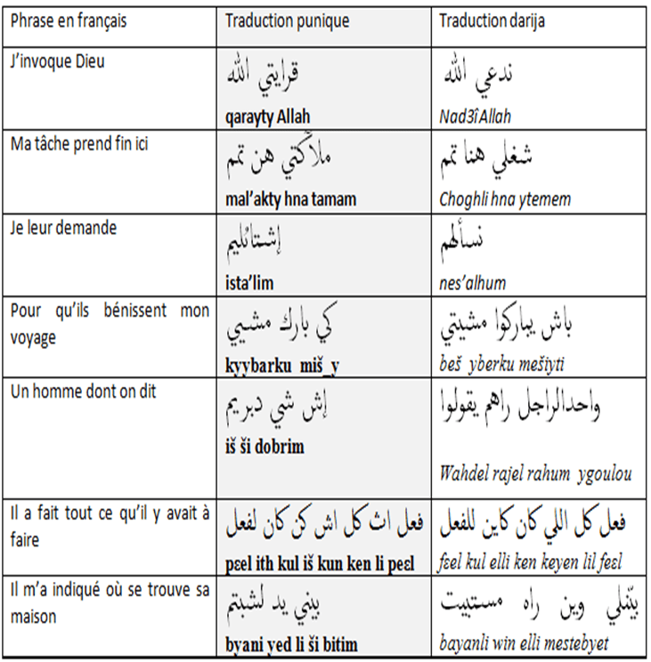 A ces échantillons lexicaux, il faut mentionner la survivance de bien mots grammaticaux ( ب – مع- عل- etc.), de verbes, de prépositions de lieu, de temps, de manière et bien d’autres matériaux propres à une langue. Nous retrouverons plus loin cette même langue à partir de textes attestés. On mesurera mieux l’ampleur de l’héritage linguistique punique dans notre langue de communication majoritaire au Maghreb, le maghribi.