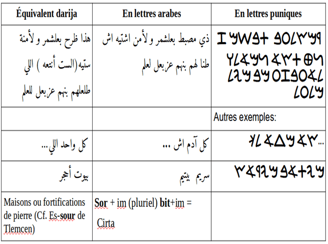 Commençons par nous faire une idée de la façon dont parlaient les Maghrébins, 1000 ans avant l’émergence de la langue arabe. Dans le tableau qui suit, nous présentons, de droite à gauche, des échantillons (1) en écriture punique, (2) dans une transcription alphabétique arabe et (3) dans leur évolution en darija.
