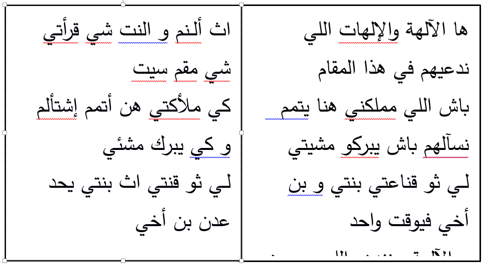 On constate, avant tout, une différence de vocabulaire : [ظرح] = [مصبطت] (Stèle) ; [زوجته] = [اشت] (épouse+pronom) ; [طلع] = [طن] (élever, ériger). Mis à part le [ه] non réalisé (= *) dans [ṭalaεl*om bni*om] – chose qui pourrait s’apparenter à un « accent » régional –, l’énoncé devient quasiment recevable pour un maghribiphone contemporain.