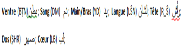 – bras/main (يد) -coeur (لب) – langue (لسن) -dos (صهر) – tête (ر اش) -vêtement (كسي);-
