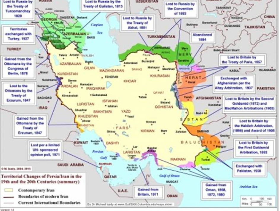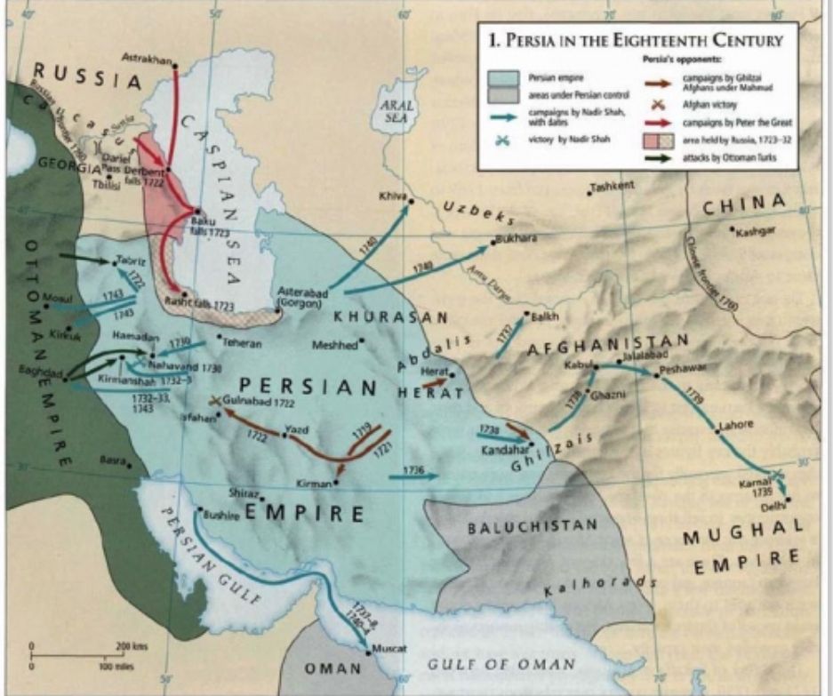 Au début du 18ème siècle, régnait le dernier des grands Shahs de Perse, Nadir – le « Bonaparte de l’Asie ». Nadir Shah conquiert l’Irak, envahit l’Inde et met à sac Delhi. La Perse, comme la Chine, s’est alors repliée sur elle-même et a stagné, tandis que l’Occident acquérait une énorme supériorité technologique. Les Lumières n’ont pas pris racine en Perse ou en Chine (contrairement, par exemple, à l’Empire ottoman). La Perse a continué à se rétrécir tout au long de l’histoire, avec des dynasties de moins en moins importantes qui se succédaient, les Perses embrassant l’isolationnisme (en cela, ils ressemblaient à la Russie tsariste et aux Chinois) jusqu’à ce qu’en 1941, la Perse devienne un État colonial fantoche.