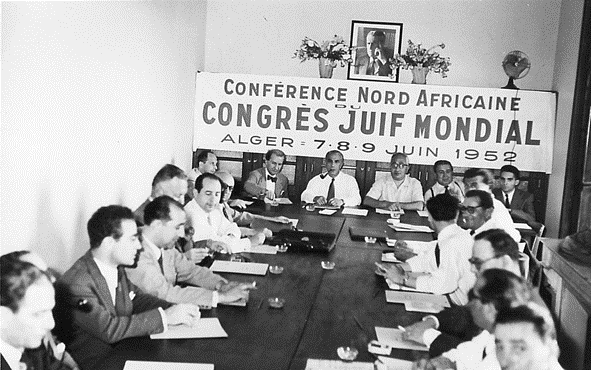Le Mossad était présent en Algérie pour combattre le FLN. Un congrès juif mondial s’est tenu à Alger les 7, 8 et 9 juin 1952 (voir photo ci-dessus). Le portail juif francophone ‘JForum.fr’ a publié un texte en date du 28 mai 2019 qui relate, à travers le témoignage de l’agent du Mossad Ibrahim Barzilai[29], honoré par le président israélien Reuven Rivlin et le chef du Mossad Yossi Cohen en 2016 pour services rendus, le travail accompli par le Mossad. Dans le texte, on peut lire entre autre : « … Le Mossad était actif en Afrique du Nord, il (Barzilai) avait armé et réactivé des cellules dormantes à Constantine pour combattre le FLN… que tous les agents du Mossad étaient mariés et envoyés en couple dans les communautés de Constantine, Marrakech, Casablanca, Tanger, Alger, Oran et Tunis… ».