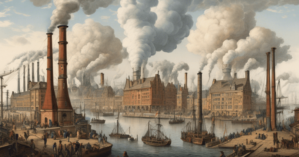 Elle débute au milieu du XVIII° siècle. Elle est caractérisée par un enchaînement d’inventions marquantes, surtout celle de la machine à vapeur en 1769. En 1829, l’invention d’un ingénieur anglais perfectionne des locomotives à vapeur, si bien que le transport à grande vitesse de passagers et de marchandises sur des chemins de fer, sillonne bientôt le monde entier. Elles ont fait basculer les sociétés agricoles et artisanales vers un nouveau modèle reposant sur le commerce et l’acquisition d’un capital. Elle transforme le paysage économique, social, politique et culturel de l’Europe, puis du monde entier avec une nouvelle phase du colonialisme. Elles ont fortement contribué à l’essor du capitalisme. La nouvelle classe ouvrière a troublé l’ordre politique avec Karl Marx.