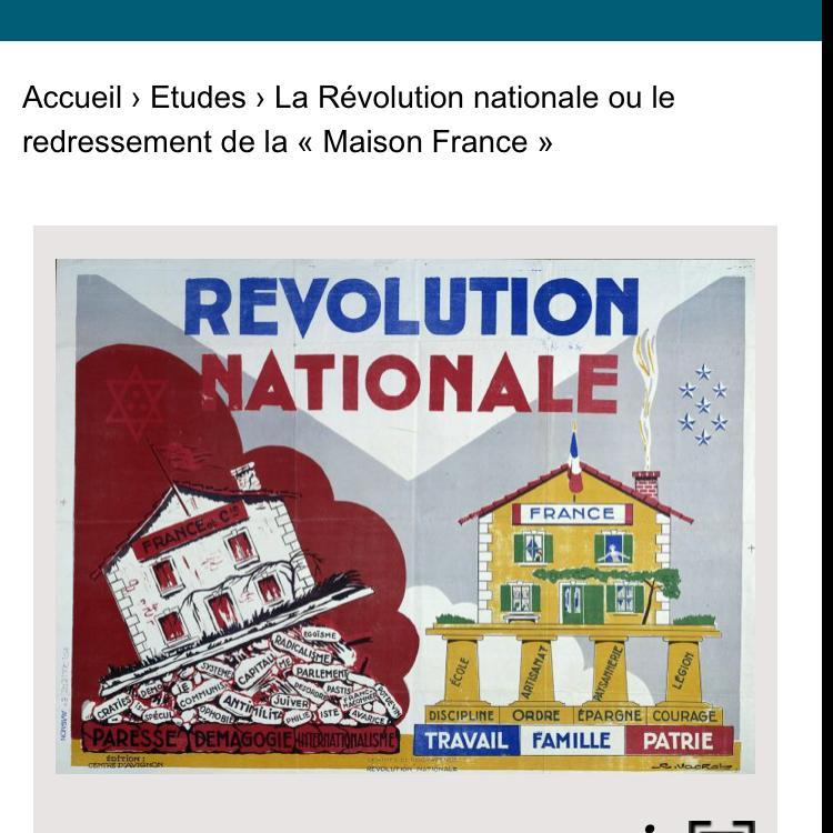 Dans son message aux Français du 25 juin 1940, Pétain annonce un « ordre nouveau ». « C’est à un redressement intellectuel et moral que d’abord, je vous convie ». La devise républicaine « Liberté, Égalité, Fraternité » est remplacée le 15 septembre, par le slogan « Travail, Famille, Patrie ». Cette devise était celle des Croix-de-feu dans les années 1930, et du Parti social français (PSF) dès 1933. .Auparavant, dès 1902, celle de la Fédération nationale des Jaunes de France, syndicat antisémite, collaborateur de classe qui tente de s’opposer à la CGT,